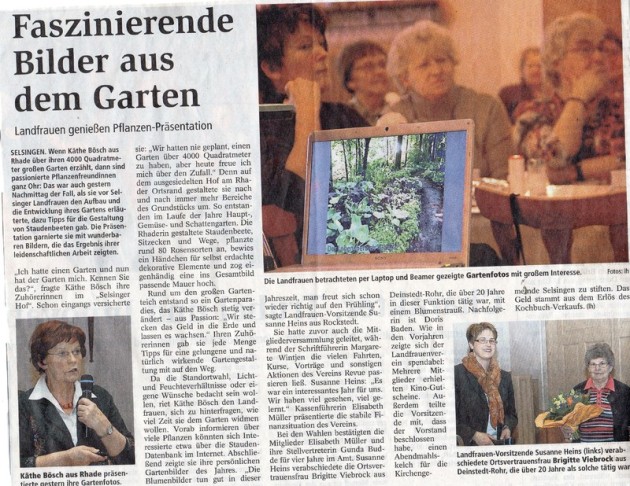 Nach jahrelanger gärtnerischer Erfahrung konnte ich viele Erkenntnisse sammeln, aus denen ich einen Lichtbildervortrag zusammengefasst habe. Ich zeige die Entwicklung unseres Gartens, halte den Fachvortrag "Stauden für jeden Standort die Richtige" und zeige die schönsten Fotos des Gartenjahres aus unserem Garten. Inzwischen durfte ich auf etlichen Landfrauenversammlungen referieren.